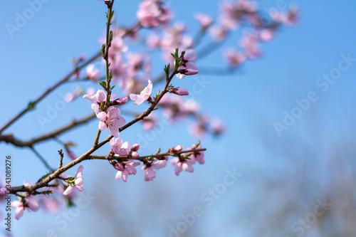 Pink flowers on a tree in spring close-up. Peach blossoms. Bright blue sky. Beautiful spring background, wallpaper.
