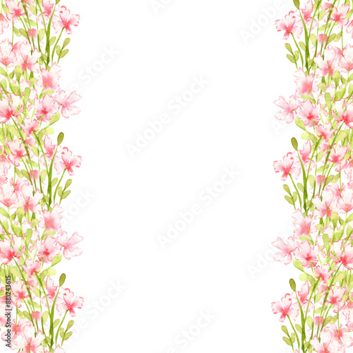 small, pink, flower, left, right, watercolor, frame, flower, illustration, leaf, nature, background, plant, springtime, design, blossom, summer, botany, bouquet, elegance, invitation, decoration, template, floral, season, fragility, celebration, flower head, border, wedding, copy space, greeting card, floral pattern, twig, card, garden, growth, meadow, print, green, isolated, bloom, environment, composition, poster, foliage, bush, chaplet