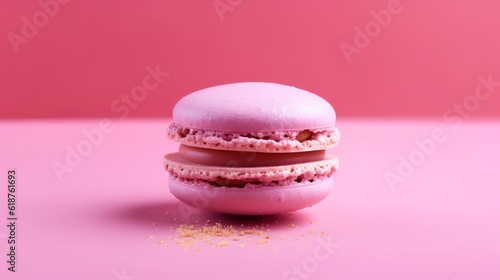 Pink French macaroon in center on pink background Generative AI