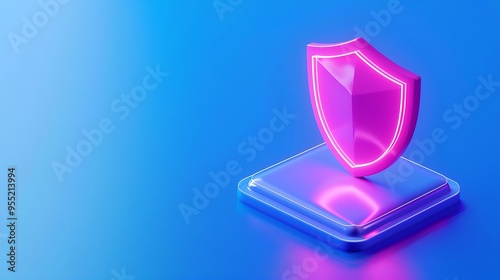 Pink futuristic glowing shield icon on a blue background, symbolizing digital security and protection in technology.
