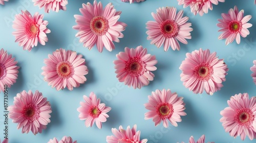 Pink Gerbera Daisies on Blue Background - Flat Lay, Floral Pattern