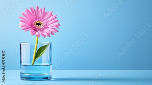 Pink Gerbera Daisy in Glass Vase on Blue Background