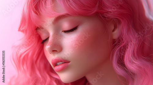 realistic, beauty, detail, pretty, art, artwork, cute, fashion, portrait, freckle, fantasy, hair, girl, model, pink lips, aesthetic, vibrant, soft, young, digital artwork, design, colours, profile, texture, closeup, gentle, eyes closed, graphic, three-dimensional, pastel, render, digital, woman, face, coiffure, pink, illustration, make-up, head shot, style, smooth skin