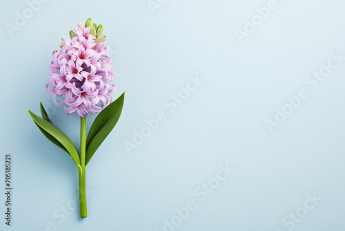 Pink Hyacinth spring flowers on left side of pastel blue background with blank copy space