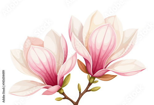 Pink Magnolia Flowers on Branch, Botanical Illustration with Transparent Background