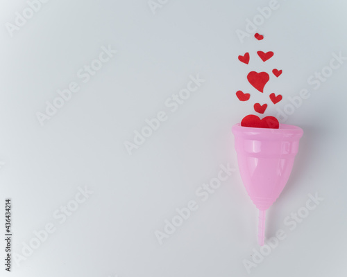 Pink menstrual cup and hearts imitating blood on a white background. Reusable personal hygiene product for women. Copy space