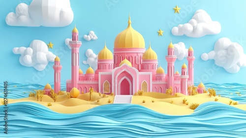 mosque, island, sea, cloud, star, pink, calm, holiday, card, ocean, beach, sand, desert, architecture, religion, islam, travel, vacation, paradise, serenity, peace, sky, sun, water, wave, gold, dome, minaret, building, faith, spirituality, hope, summer, tropical, exotic, beautiful, scenic, artwork, illustration, design, graphic, image