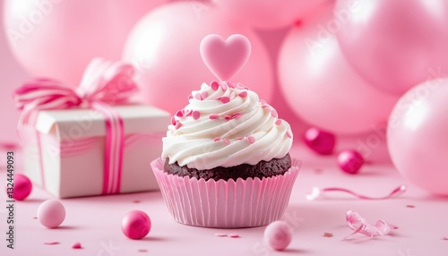 Pink Mother'S Day And Valentine'S Day Template Featuring Cupcake, Balloons, And Gift Box. Perfect For Celebrating Love And Appreciation.