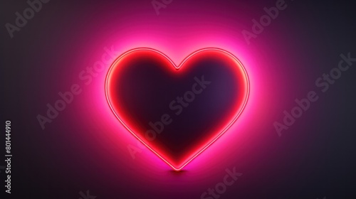 Pink neon light heart shape on night brick wall.