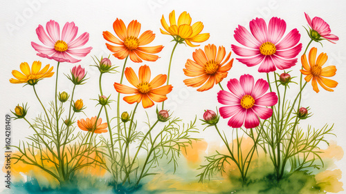 Pink orange yellow cosmos flowers watercolor image