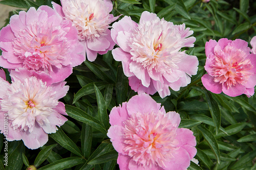Pink peonies and buds with leaves. Luxurious fresh flowers in the flowerbed. Bright spring day in the park. Abundant flowering.