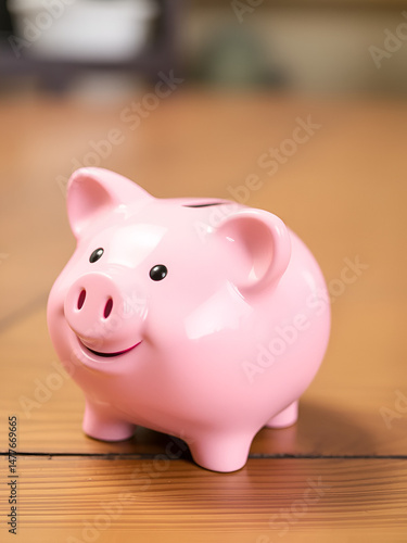 Pink piggy bank on wooden surface, smiling gleefully with blurred background
