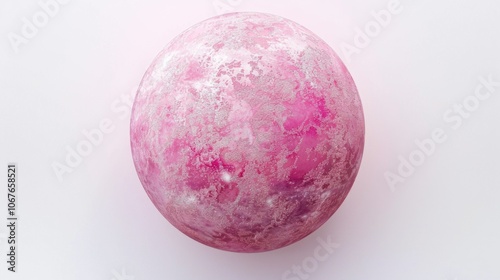 Pink planet with a white surface. The planet is round and has a pinkish hue. The color of the planet is very bright and stands out against the white background