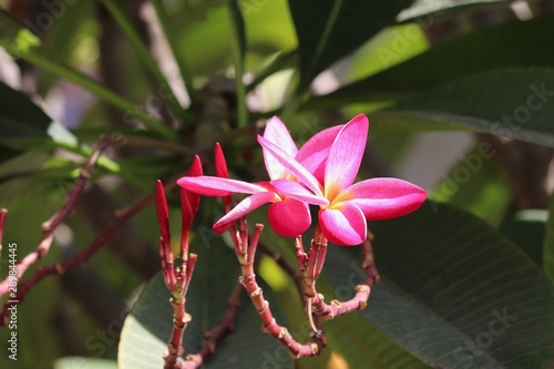 Pink plumeria flowers with green leaves on tree in garden