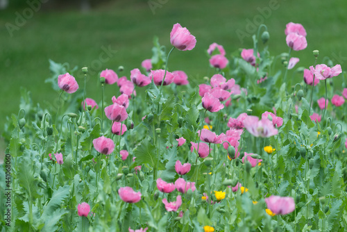 pink poppies in bloom in a Victorian-themed public garden