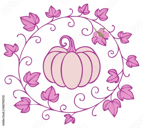 pumpkin, vine, leaf, swirl, floral, seasonal, autumn, fall, decoration, decorative, nature, plant, organic, graphic, illustration, outline, border, frame, circular, pink, purple, natural, growth, design, motif, elegance, simple, clean, botanical, harvest, harvested, fall harvest, ornamental, stylised, creative, graphic design