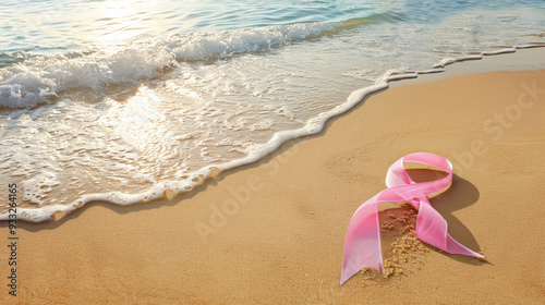 Pink ribbon drawn in sand on peaceful beach at tide's edge