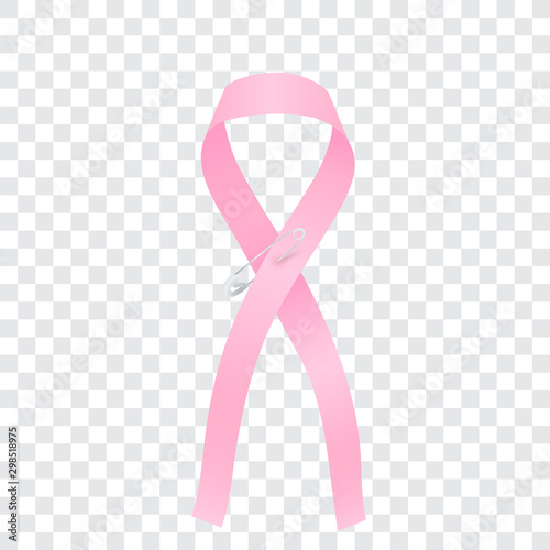 Pink ribbon with safety pin. Vector breast cancer awareness icon on transparent background