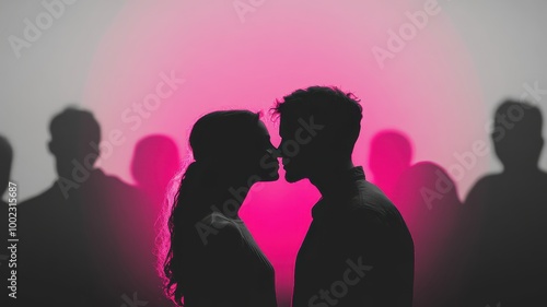 Pink silhouette of couple standing in monochrome crowd of different people,surreal unique and different concept,loneliness in society,shadow,freedom,Love,be yourself,Stand out from the crowd.