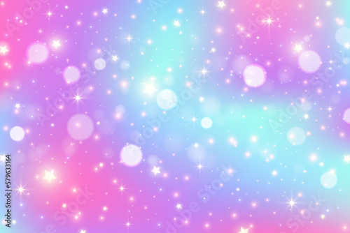 Pink sky with stars and bokeh. Kawaii fantasy background. Magic glitter space with iridescent texture. Abstract vector wallpaper