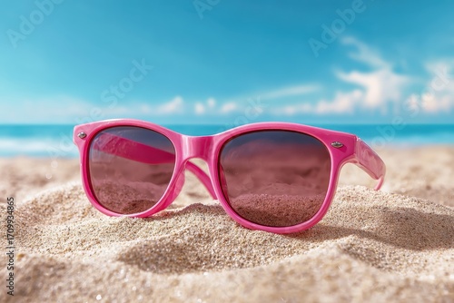 Pink sunglasses resting on soft sandy beach at midday with ocean waves in the background and a clear blue sky