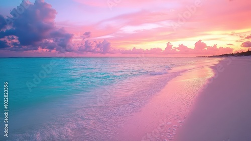 ocean, beach, sunset, sky, cloud, pink, blue, water, wave, sand, horizon, calm, tropical, paradise, tranquil, serenity, gold, glow, light, summer, travel, vacation, coastline, peaceful, dreamy, idylli, natural, beautiful, photo