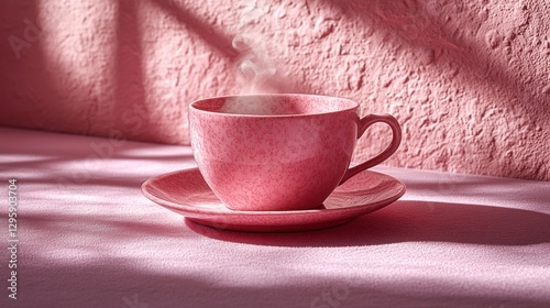Pink teacup steaming, sunlit room