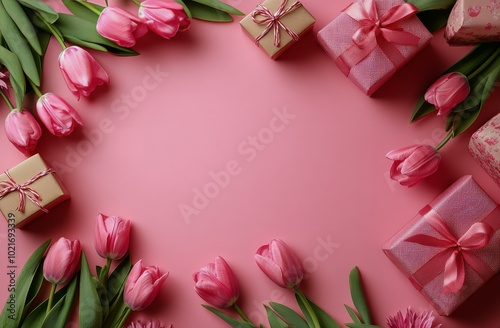 Pink tulips and gift boxes arranged on a pink background for a festive celebration