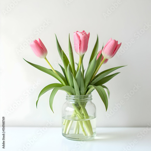 tulip, pink, flower, bouquet, jar, glasses, arrangement, green, leaf, stem, water, white, surface, table, background, floral, closeup, minimalist, studio, fresh, vibrant, spring, blooming, flower petals, nature, still life, home, decor, simple, elegant, fragile, delicate, isolated, bright, light, beauty, natural, domestic, interior, horizontal, single, plant, growing, decoration, gift, celebration, mother's day, greeting, wedding