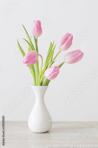 pink tulips in white ceramic vase on wooden table on background white wall