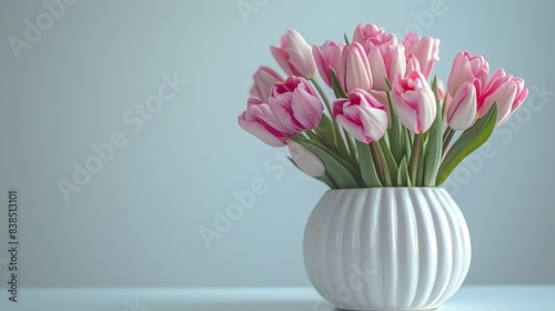 Pink Tulips in White Vase, Minimalist Floral Arrangement, Fresh Spring Blossoms, Home Decor, Copyspace for Text, Elegant Flower Display
