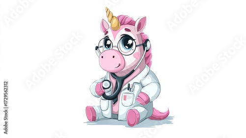Pink unicorn doctor in a white lab coat, wearing glasses and a stethoscope, sitting