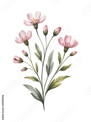 Pink watercolor blossoms with hand paint green leaves, pink flower branch isolated..