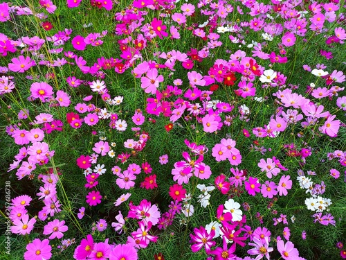 Pink, white and red cosmos flower are bloom at field crop, background.