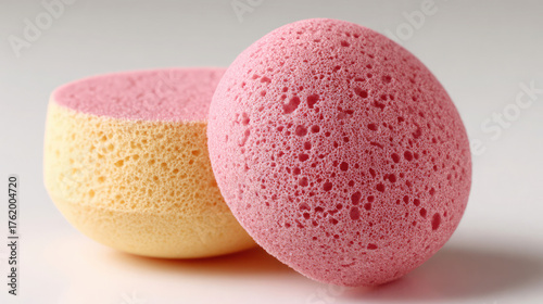 sponge, sponge, texture, texture, porous, pink, yellow, beauty, beauty product, hygiene, cleansing, bathe, skincare, bathroom, wellness, clean, soft, cosmetic, cosmetic, closeup, detail, material, background, surface, product, branding, minimalist, minimal, health, health care, feminine, gradient, smooth, oval, gentle, photo, photograph, macro, studio