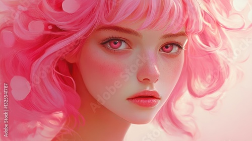Pink-haired girl portrait; dreamy, pastel style; bokeh background