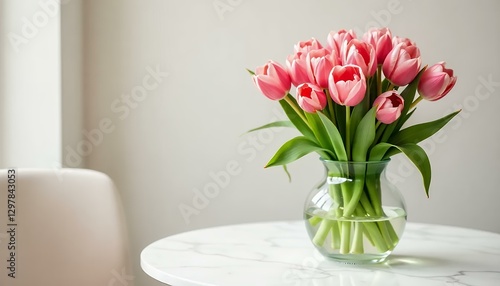 tulip, flower, pink, bouquet, vase, table, marble, bloom, floral, arrangement, green, spring, flower petals, glasses, decoration, home, plant, interior, minimalist, fresh, style, modern, design, light, room, elegant