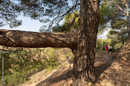 Pino enorme con gran rama y al fondo senderistas caminan por una senda en las inmediaciones de Daroca, Zaragoza, Aragon, España.