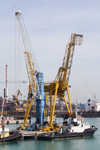 Piombino, Italy -Cranes and moored boats in the Industrial Port of Piombino