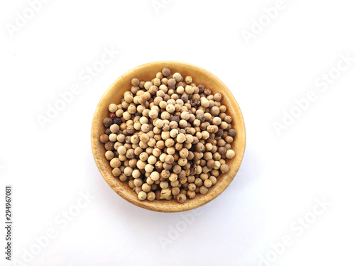 Piper Albi Linn / White Pepper (known as Lada or Merica Putih in Indonesia) on a wooden bowl at white background