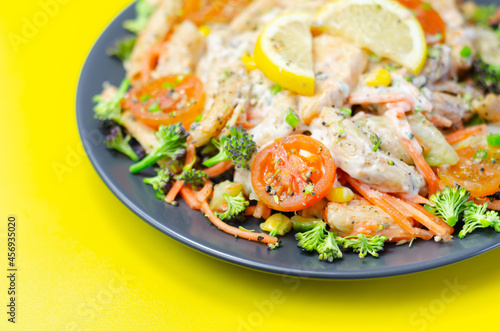 chicken, vegetable, pasta, sauce, salad, basil, black pepper, breast, broccoli, carrot, cayenne, cheddar, cheese, chives, coriander, cucumber, cookery, cumin, dressed, dressing, food, fresh, garlic, healthy, iceberg, lemon, lettuce, lunch, marinated, meal, mix, olive, paprika, pepper, pimiento, plate, prepared, sour cream, spiced, style, sweet corn, tomatoes, turmeric, vinegar, white, wheaten