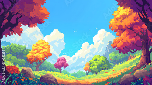 video game, landscape, autumn, fall, forest, tree, path, trail, colourful, vibrant, bright, sunny, sky, cloud, leaf, foliage, nature, scenery, idylli, whimsical, fantasy, illustration, digital artwork, graphic, design, wallpaper, background image, artwork, painting, art, autumn leaf, pixelated, retro, environment, cartoon