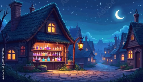 night, fantasy, village, magical, shop, whimsical, artwork, game, charming, glow, potion, illuminated, pixelated, digital artwork, cosy, crescent moon, enchanting, star, serene, atmospheric, night scene, storytelling, adventure, nostalgia, creative, quaint, mystical, retro, mediaeval, building, street, house, illustration, digital illustration, art, design, graphic, background, wallpaper, video game, rpg, fantasy art, concept, landscape, sky, star, moon, cloud, light