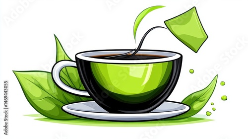 tea, teabag, cup, saucer, leaf, illustration, drink, beverage, green, vibrant, bright, fresh, refreshing, healthy, relaxing, calm, serene, clean, simple, minimal, cute, art, design, graphic, food