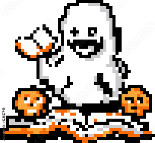 ghost, halloween, pixel, cartoon, horror, reading, book, symbol, skittish, character, game, pixelated, illustration, staff