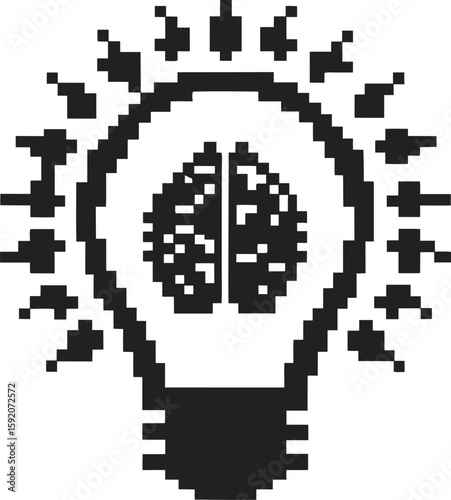 Pixel art lightbulb with brain inside, creative idea innovation, digital intelligence concept symbol in black and white