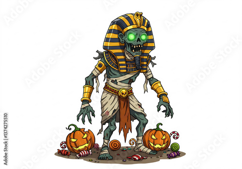 zombie, halloween, undead, egypt, pharaoh, mother, scarey, creepy, monster, illustration, game, character, design, digital artwork, cartoon, skittish, horror, green, gold, brown, pumpkin, candy, sweet, treat, holiday, october, celebration, retro, vintage, gaming, art, artwork, graphic, image, picture, digital illustration