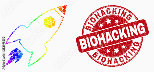 Pixel bright spectral space rocket mosaic icon and Biohacking seal stamp. Red vector round grunge seal stamp with Biohacking title. Vector collage in flat style.