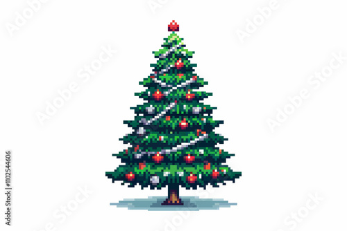 Pixel Christmas tree decorated with Christmas tree decorations and topped with a shining star.