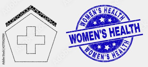 Pixel hospital mosaic icon and Women'S Health watermark. Blue vector round textured seal stamp with Women'S Health text. Vector combination in flat style.